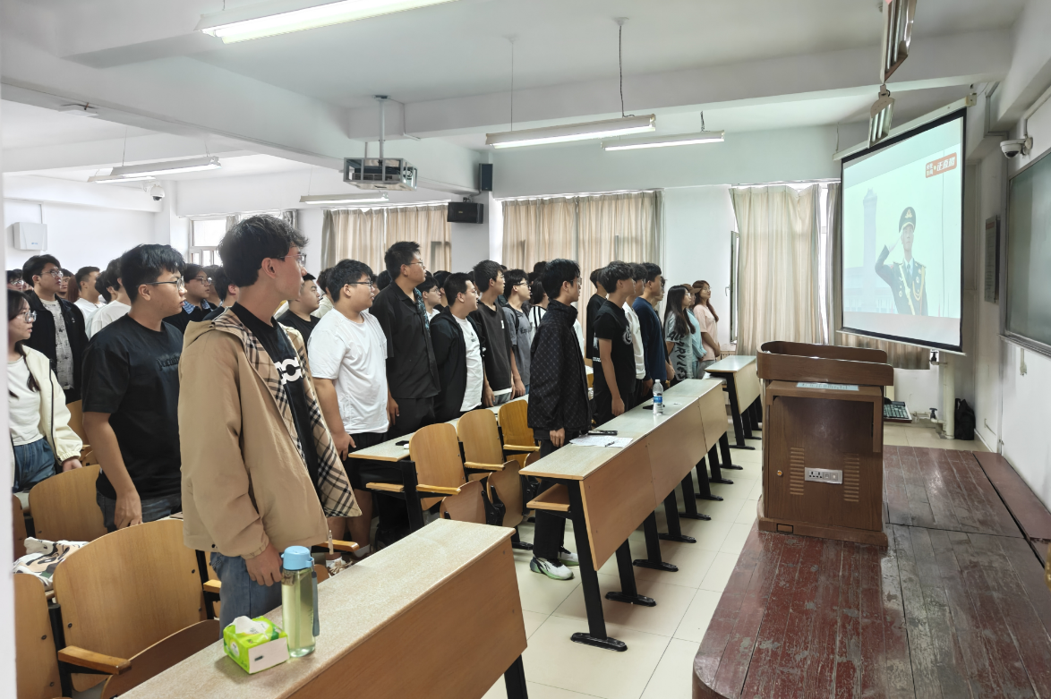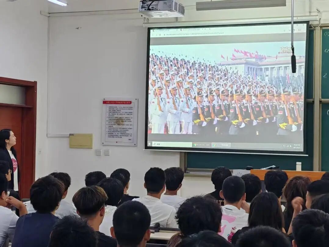 组织全院师生通过集中观礼形式,共同见证这一历史性时刻。学院领导班子成员、全体教师在稀土楼A405会议室集体观看直播,研究生在稀土楼一楼大厅,本科生在教室同步参与,通过庄严仪式与沉浸式教育,将抗战精神转化为新时代青年奋进的磅礴力量。