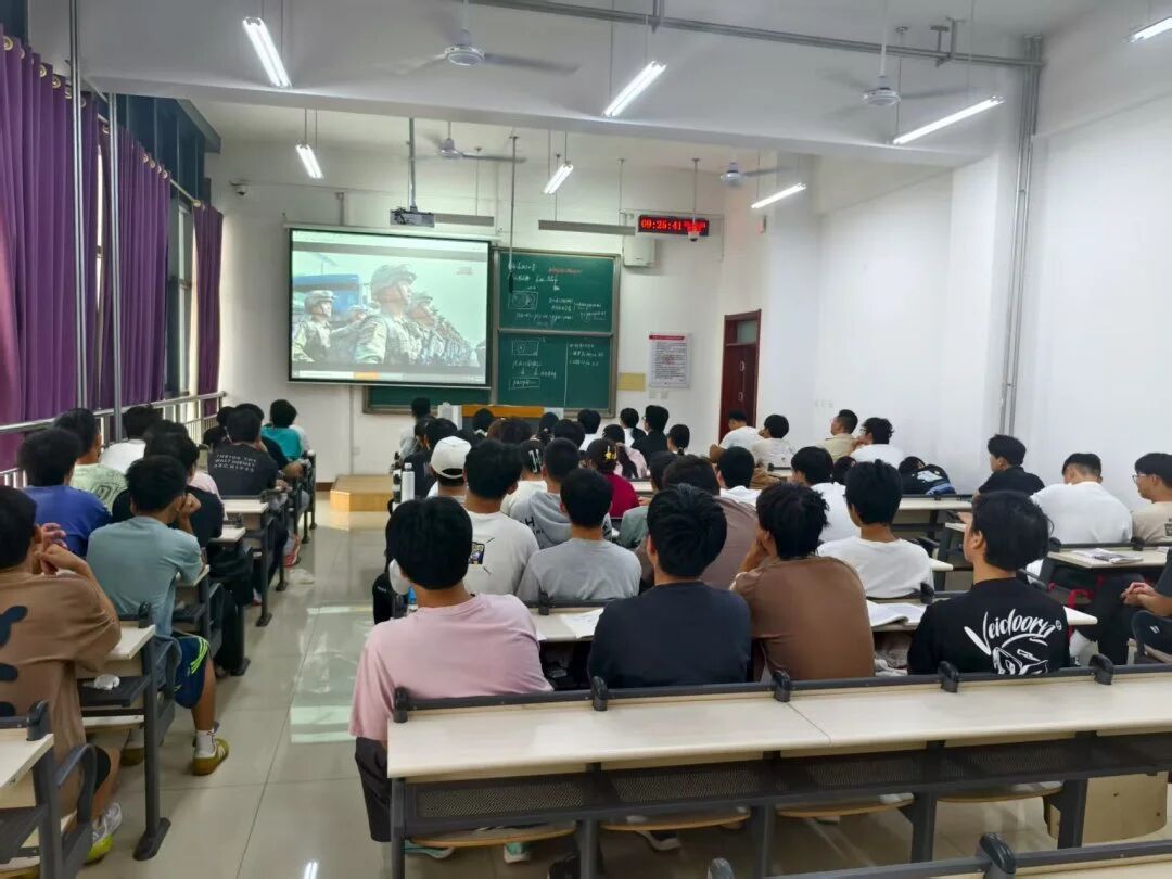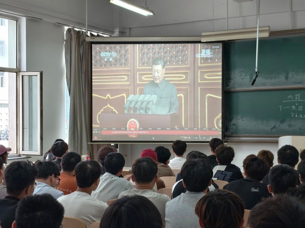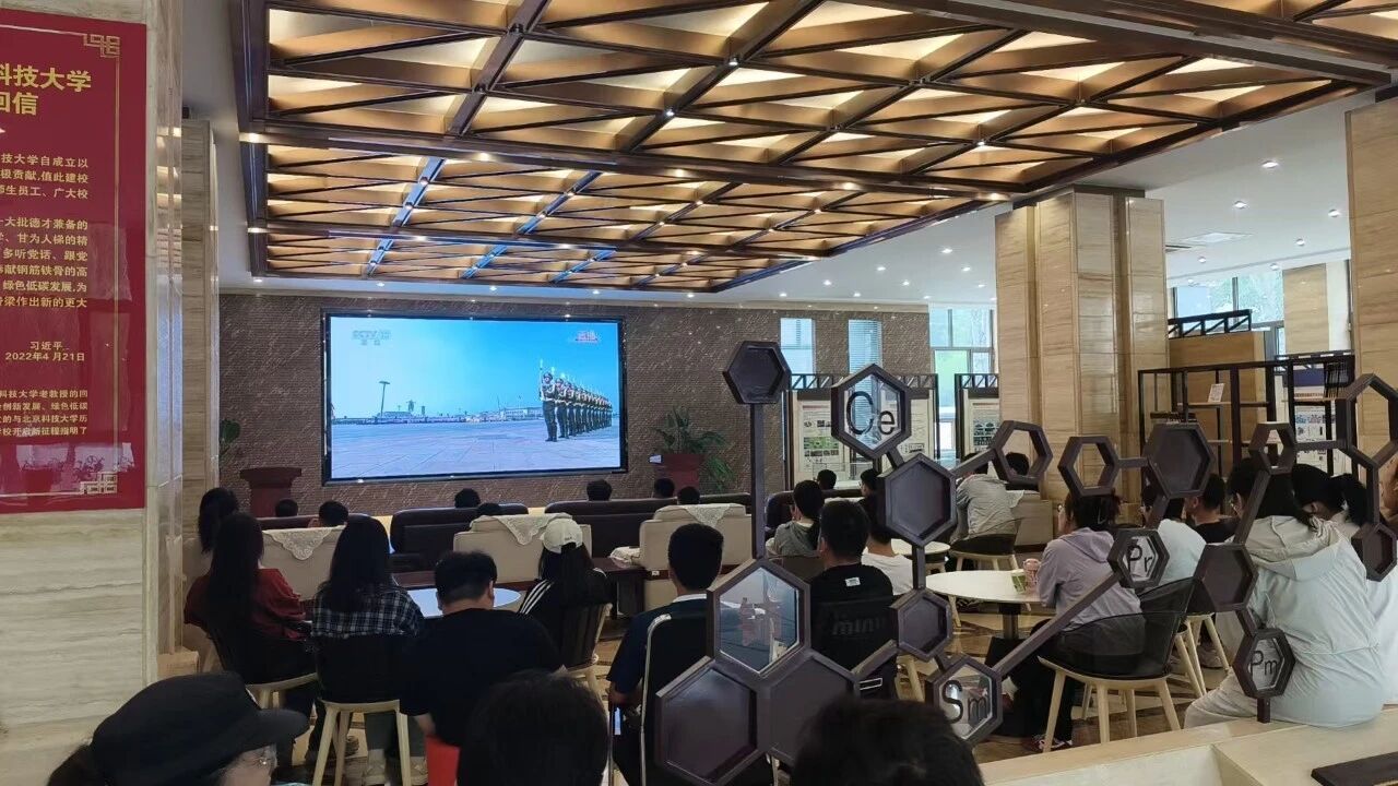 组织全院师生通过集中观礼形式,共同见证这一历史性时刻。学院领导班子成员、全体教师在稀土楼A405会议室集体观看直播,研究生在稀土楼一楼大厅,本科生在教室同步参与,通过庄严仪式与沉浸式教育,将抗战精神转化为新时代青年奋进的磅礴力量。